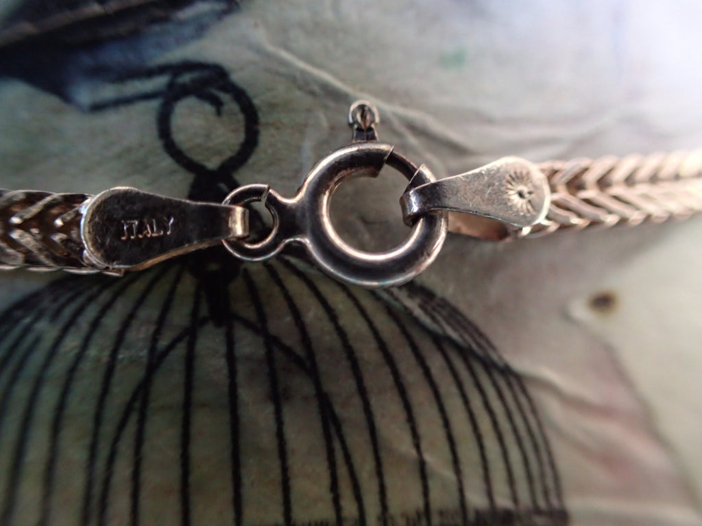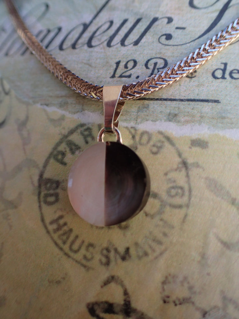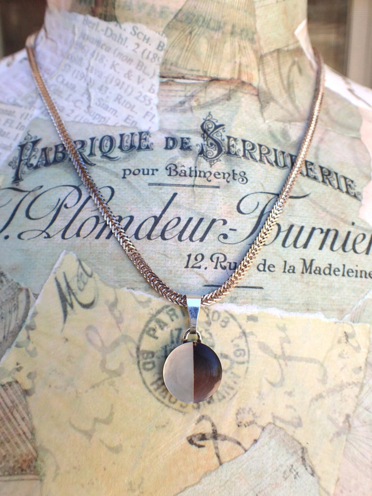 So easy to love this vintage button pendant necklace composed of a half dark & smoky, half white, iridescent mother of pearl button. This pendant is 5/8" and 1/8" thick. The vintage 18" sterling silver wheat chain is bright. This chain is truly beautiful on its own.