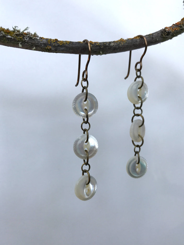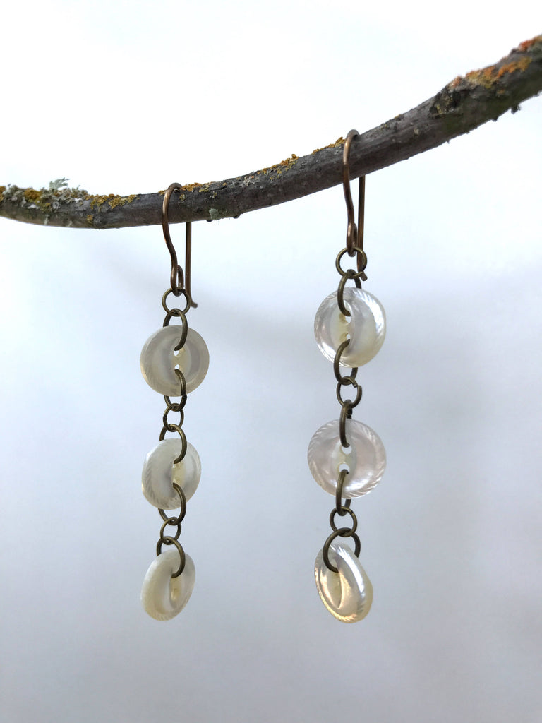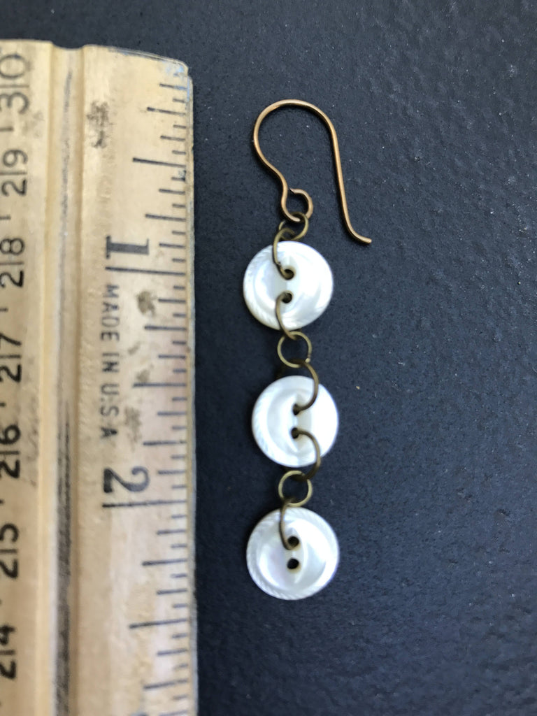 These are 3" single strand dangle earrings using vintage buttons from my collection and handmade antique brass findings. They are very light and they dance with every subtle motion of the head.