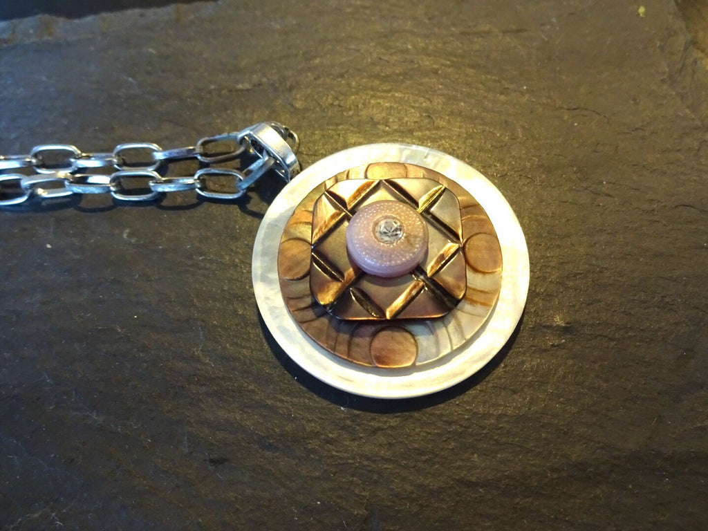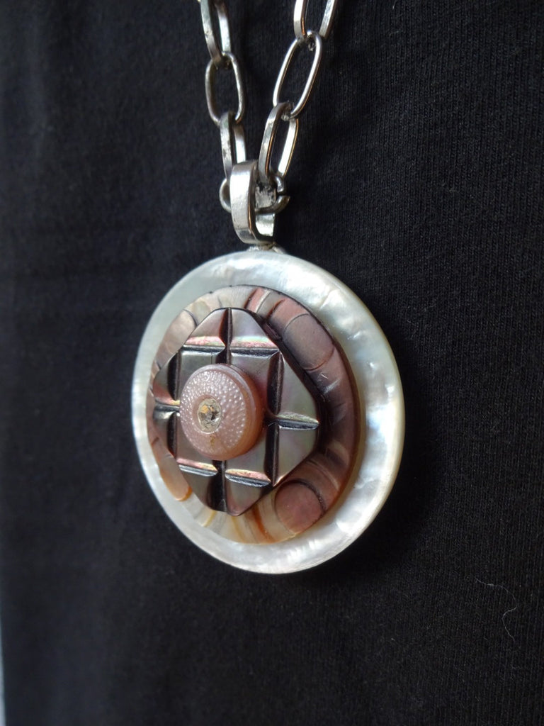 This is a large mother of pearl vintage MOP layered button pendant necklace. I started with a 2 1/4" white mother of pearl button and added a round rosy MOP button with a carved geometric pattern. Next I layered on another rosy mother of pearl square button that is carved with a linear pattern. Lastly I accented the pendant with a pink casein button set with a small rhinestone. I hung the pendant on another vintage piece, a sturdy and chunky 35 inch silver plated chain. The result is a beautiful layered button necklace you will be proud to wear or give as a gift.
