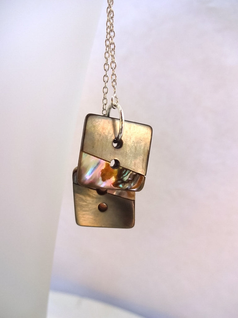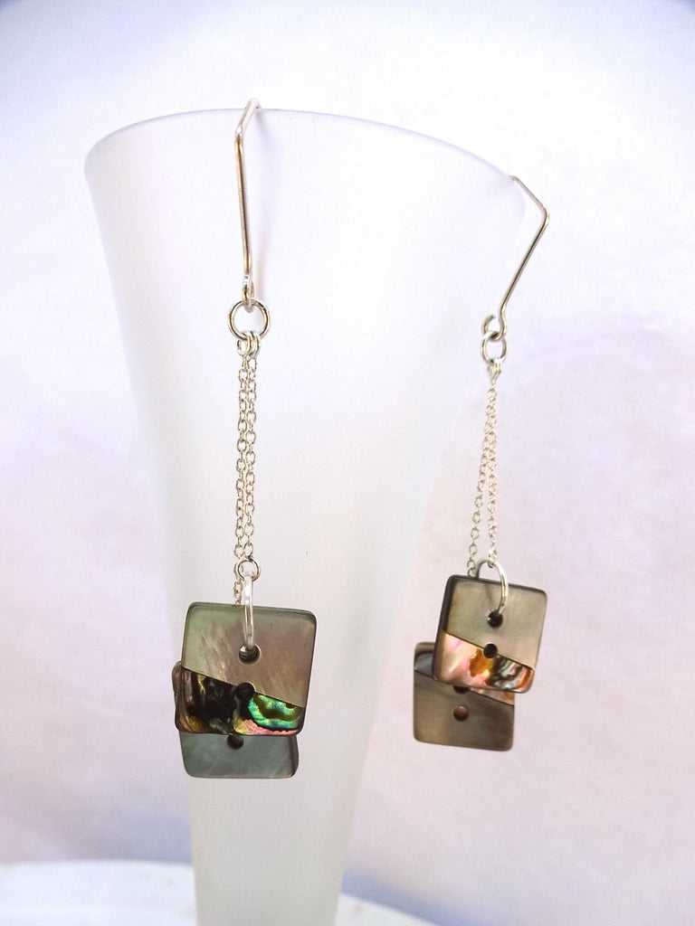 Here I've created a pair of dangle drop earrings using two vintage square abalone and mother of pearl buttons on each earring with sterling silver chains in two different lengths. These abalone buttons are inset with a silver grey mother of pearl in an offset asymmetric pattern. The buttons are 1/2" and the earrings are 2 1/4" in length. They are very light and comfortable to wear. The ear wires are angled to echo the square shape of the buttons.