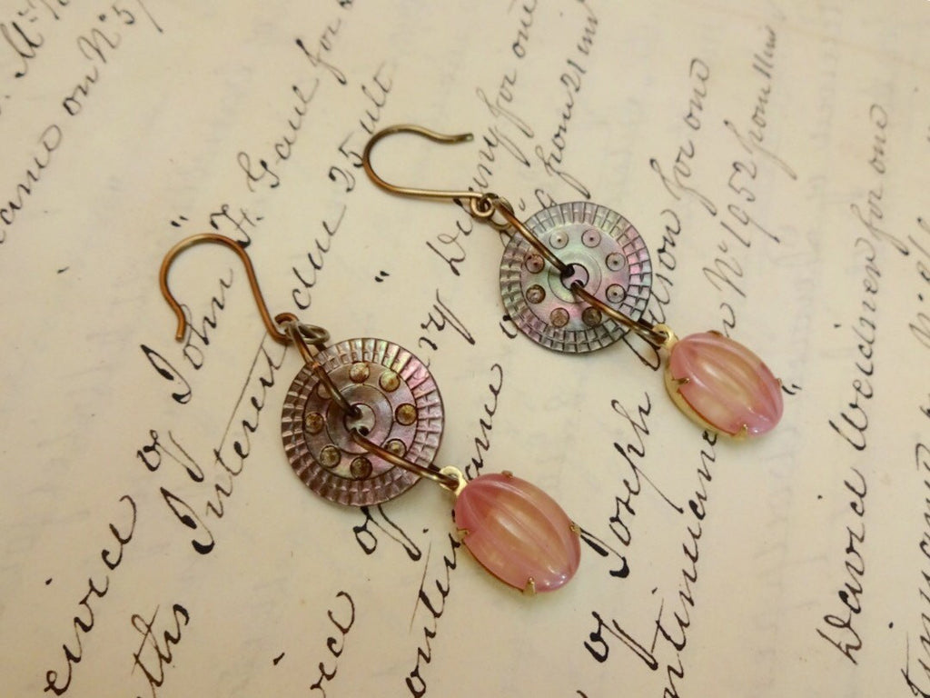 Here is a pair of dark pink mother of pearl button earrings with vintage pink glass bead drops. The buttons reflect colors of pink and turquoise. The earrings are constructed with bronze colored copper wire. They have a distinctly antique feel that I love. They are 2 1/2" long, top to bottom.