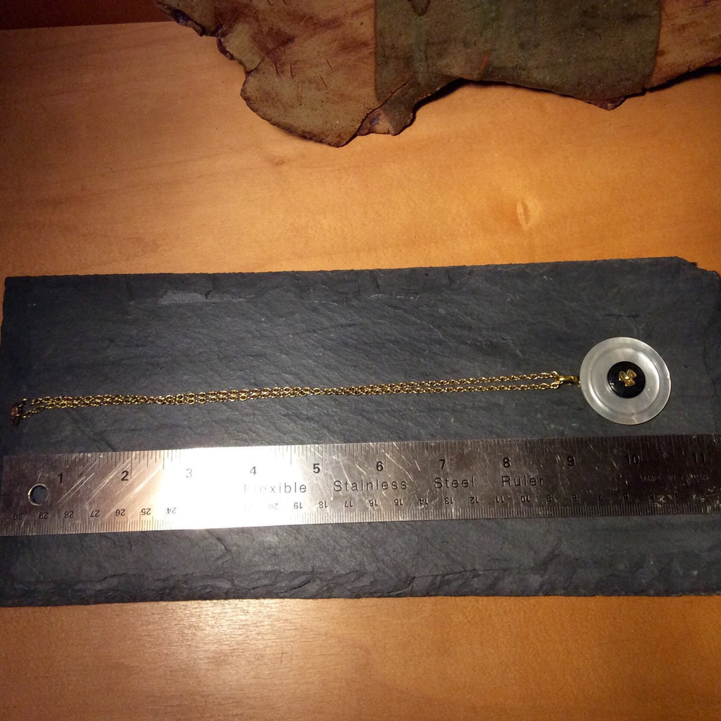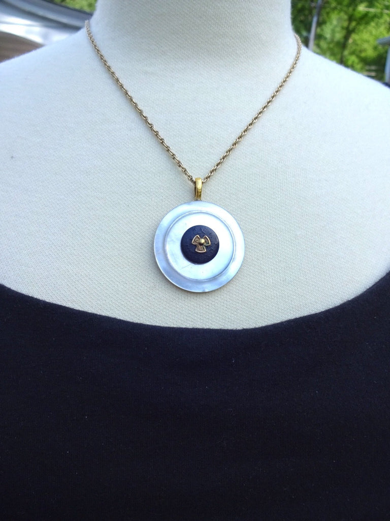 Vintage Mother of Pearl Button Pendant, MOP Antique Layered Button Necklace, Black Leather Covered Button, Brass Propeller Detail
