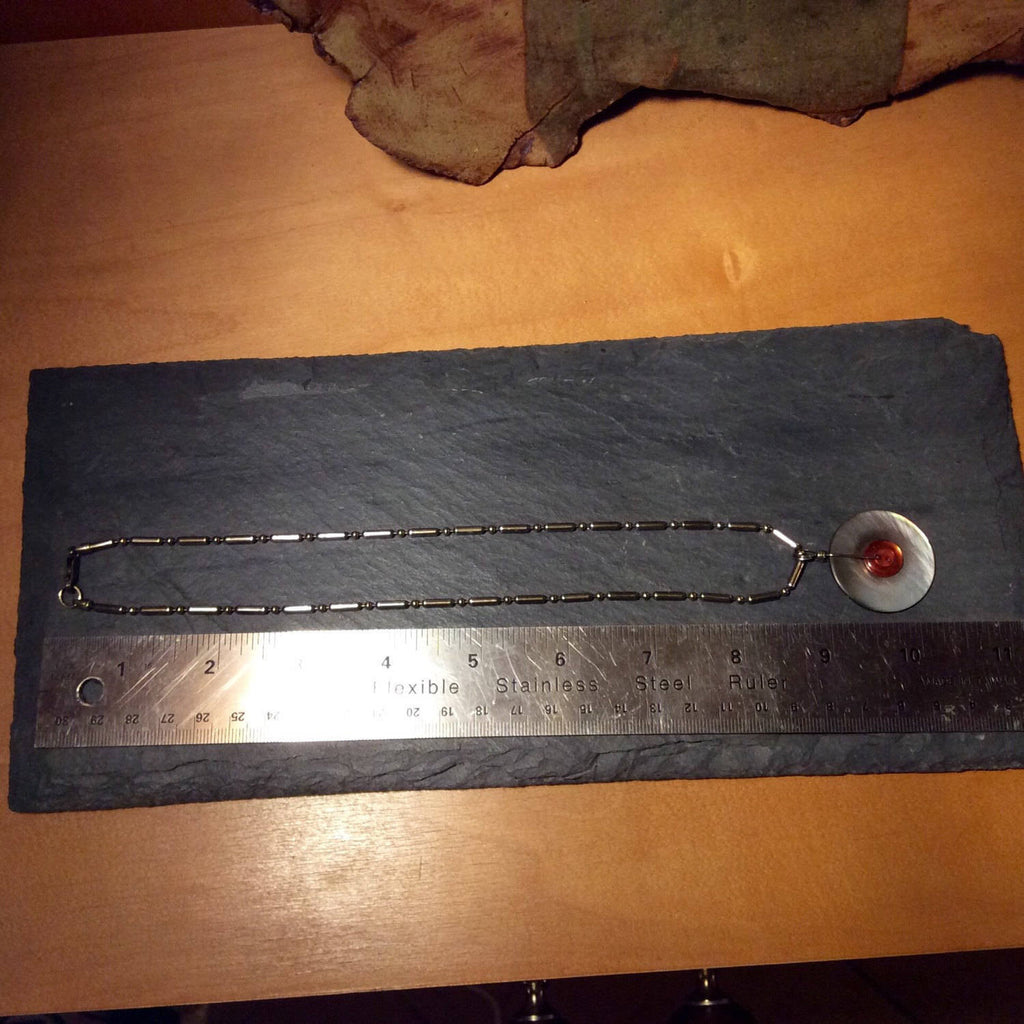 Vintage Mother of Pearl Button Pendant, Red Button Detail, Oxidized Sterling Silver Bead & Bar Chain