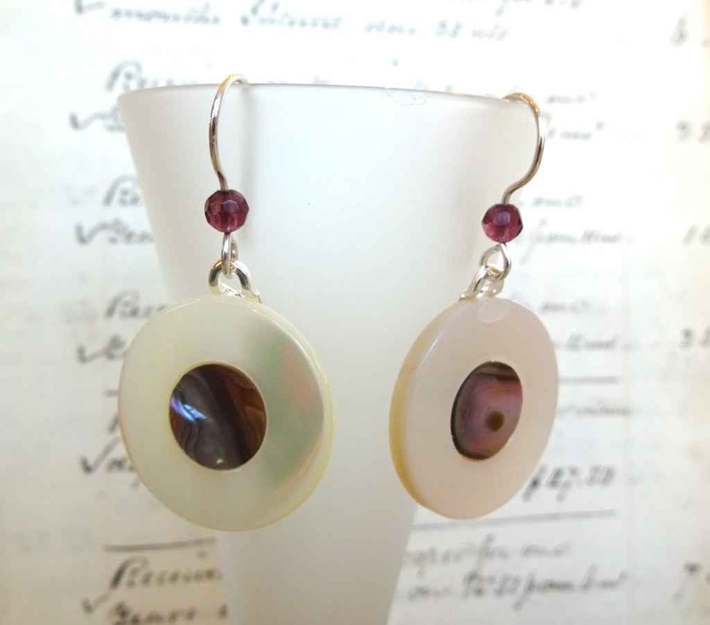 Vintage mother of pearl button earrings, smoky mother of pearl inlaid in white mother of pearl. These earrings are constructed with Sterling silver wire. The ear wires feature a vintage purple faceted crystal bead. The MOP buttons have a smooth glassy finish. They have a clean, contemporary look. The buttons are 7/8" and the earrings are 1 1/2" long.