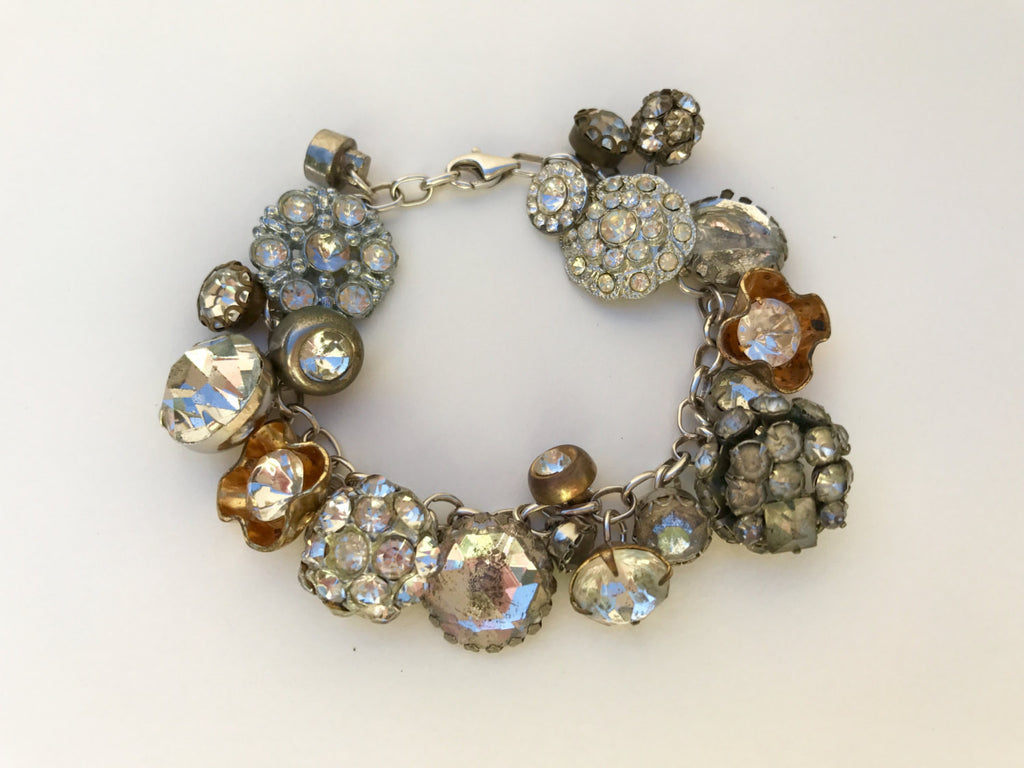 Love this rhinestone button charm bracelet on a vintage sterling silver bracelet! Some of the buttons are set in gold tone settings, and others are in silver. They are varying sizes, Some of the rhinestones look brand new and others are darkened with age. Most of the buttons are metal but there is some plastic as well. The larger buttons are attached with split rings (like a keychain) so they are securely attached to the bracelet. This is a 7 1/4" bracelet. It has a lobster claw clasp.