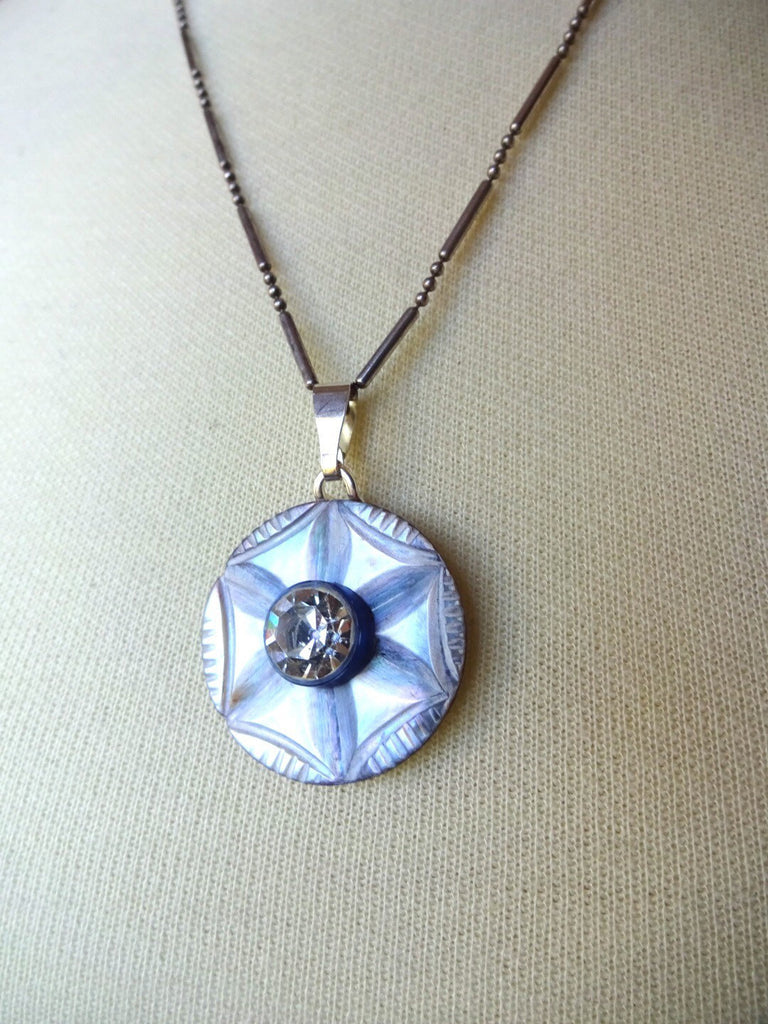 Vintage Smoky Carved MOP Button Pendant Necklace, Mother of Pearl, Rhinestone Button, Blue Casein Button, Sterling Silver Chain