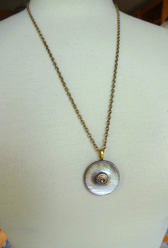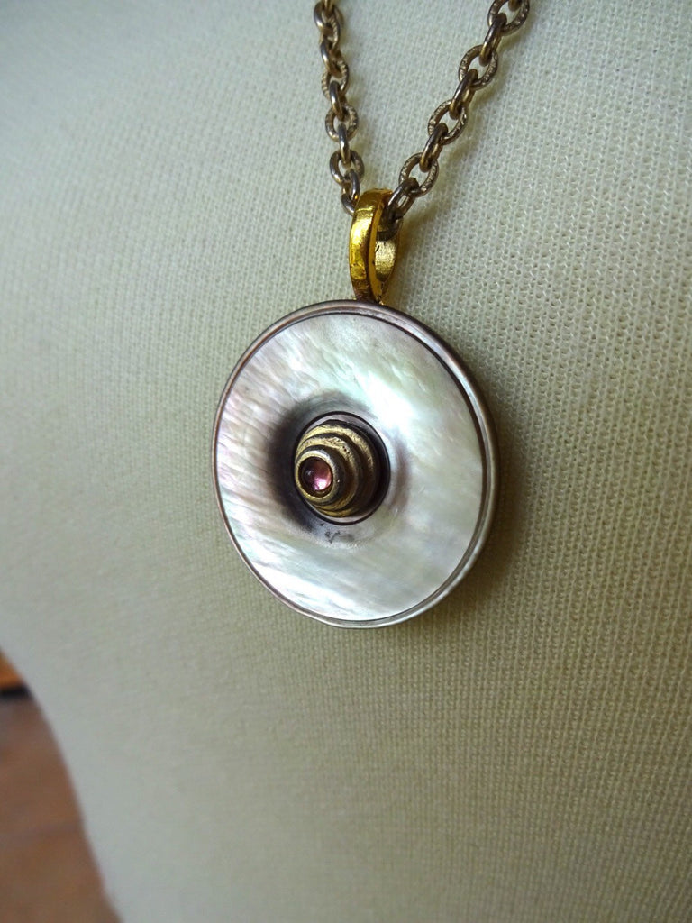 Here is a smoky mother of pearl vintage MOP layered button pendant necklace. I started with a 1 1/4" smooth contoured button with edge bead and added a gold tone modernist detail set with purple glass stone that I salvaged from a cast off piece. I finished with a gold plated pendant bail and I hung the pendant on another vintage piece, a sturdy textured gold plated sterling silver chain. The result is a beautiful layered button necklace you will be proud to wear or give as a gift.