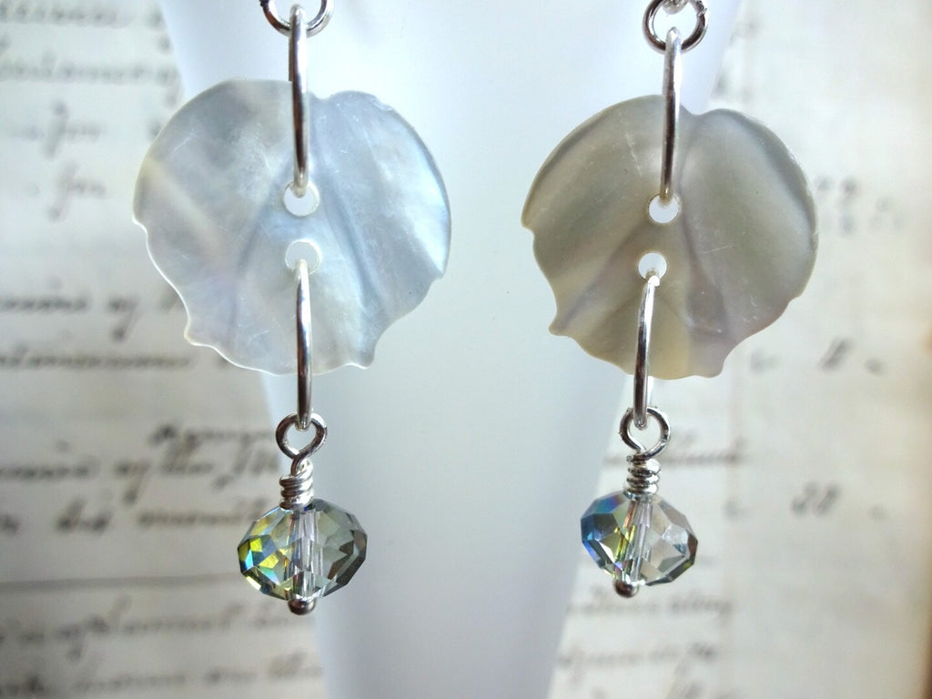 Vintage White Mother of Pearl Button Earrings, Flower MOP Buttons, Blue Crystal Bead Drops, Silver Ear Wires