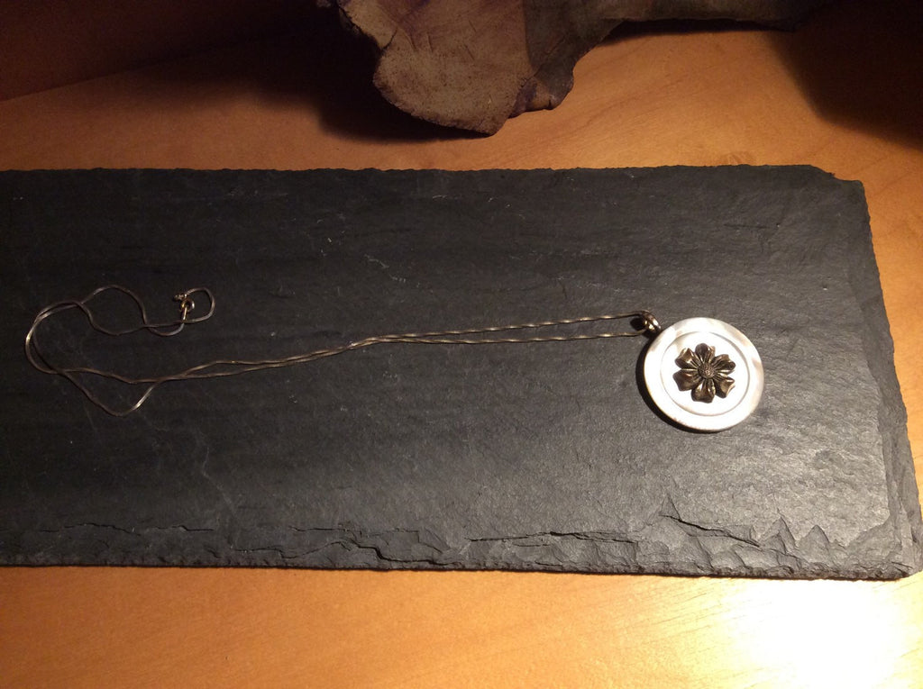 This is the perfect marriage of a silver grey natural mother of pearl button topped with a metallic silver bow button. The festive bow has such a great patina. I've hung the pendant on a beautiful vintage sterling twisted box chain, also with great patina. One of my favorites. The pendant is 1 1/2" across and the chain is 23". This would make a lovely gift.