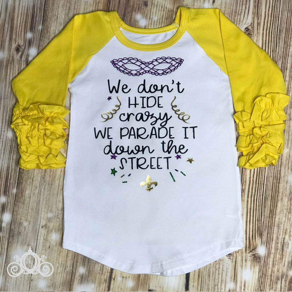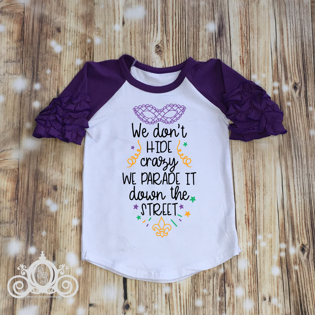 / We Don't Hide Our Crazy Parade Mardi Gras Custom Ruffle Raglan Personalized Shirt Girl Baby Toddler Shirt