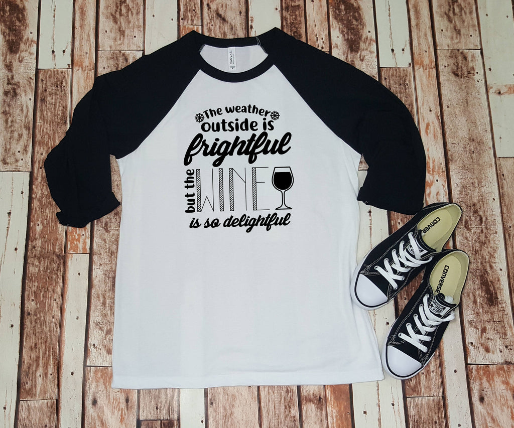 This listing is for (1) tri-blend baseball shirt, as seen in the pictures, that says: "The weather outside is frightful, but the Wine is so delightful" Perfect for the Wine Lovers this winter season!