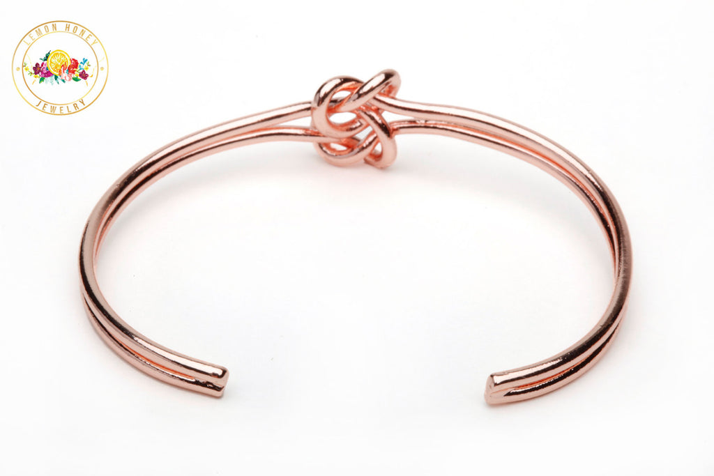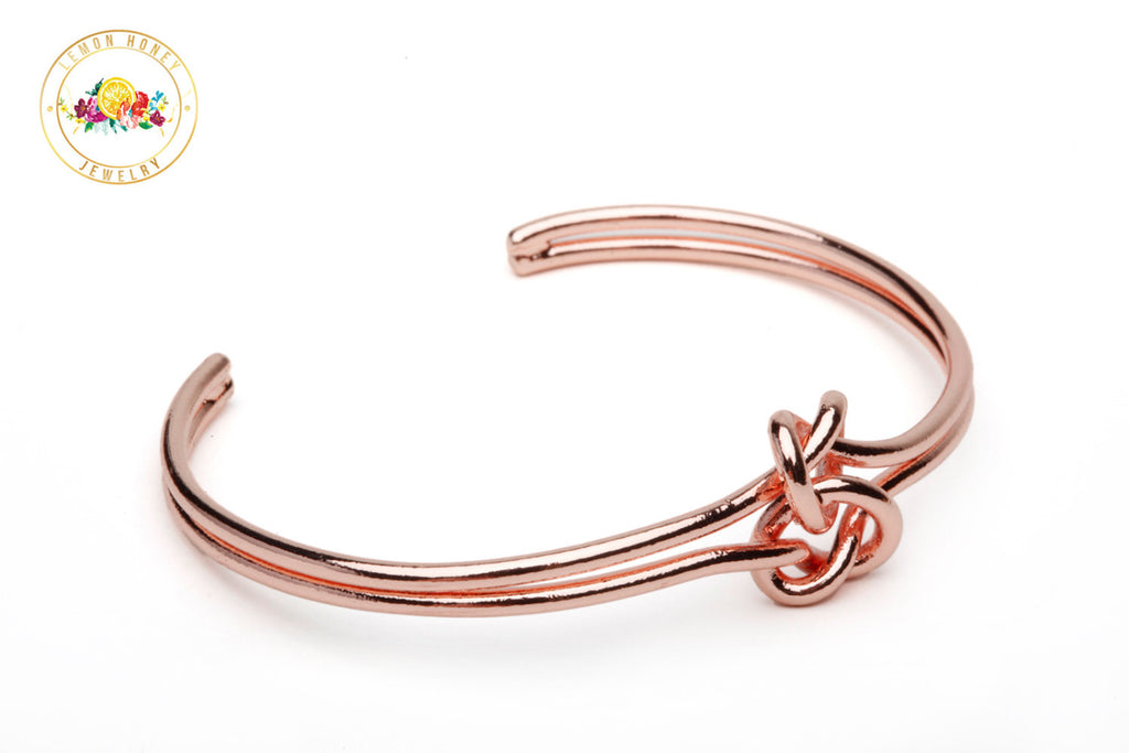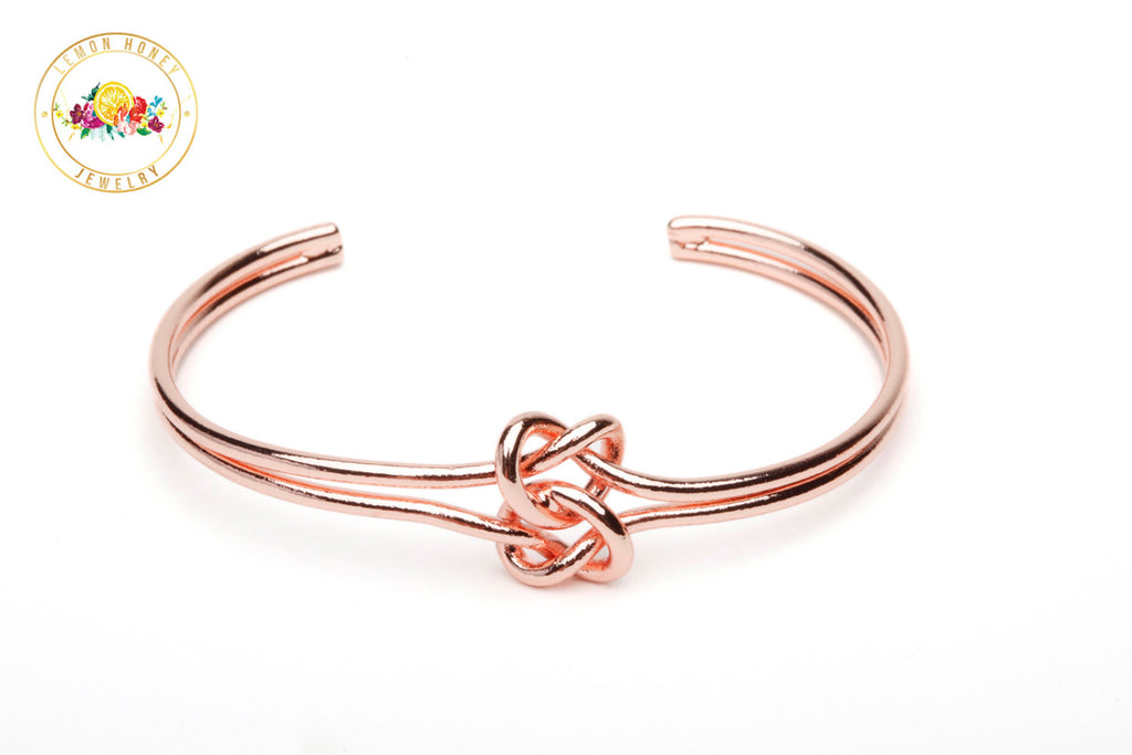The ORIGINAL double knot bracelet plated in rose gold over brass. Often imitated, but the quality speaks for itself.