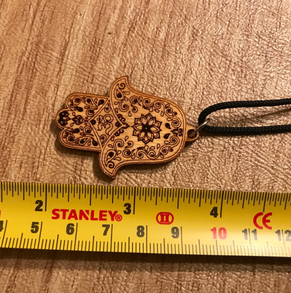 You may choose the small or large pendant. Please see photos for size. This is a wooden Hamsa pendant with an adjustable parachord necklace. It is made out of birch wood and is made to order. Please allow up to 5 business days for production.