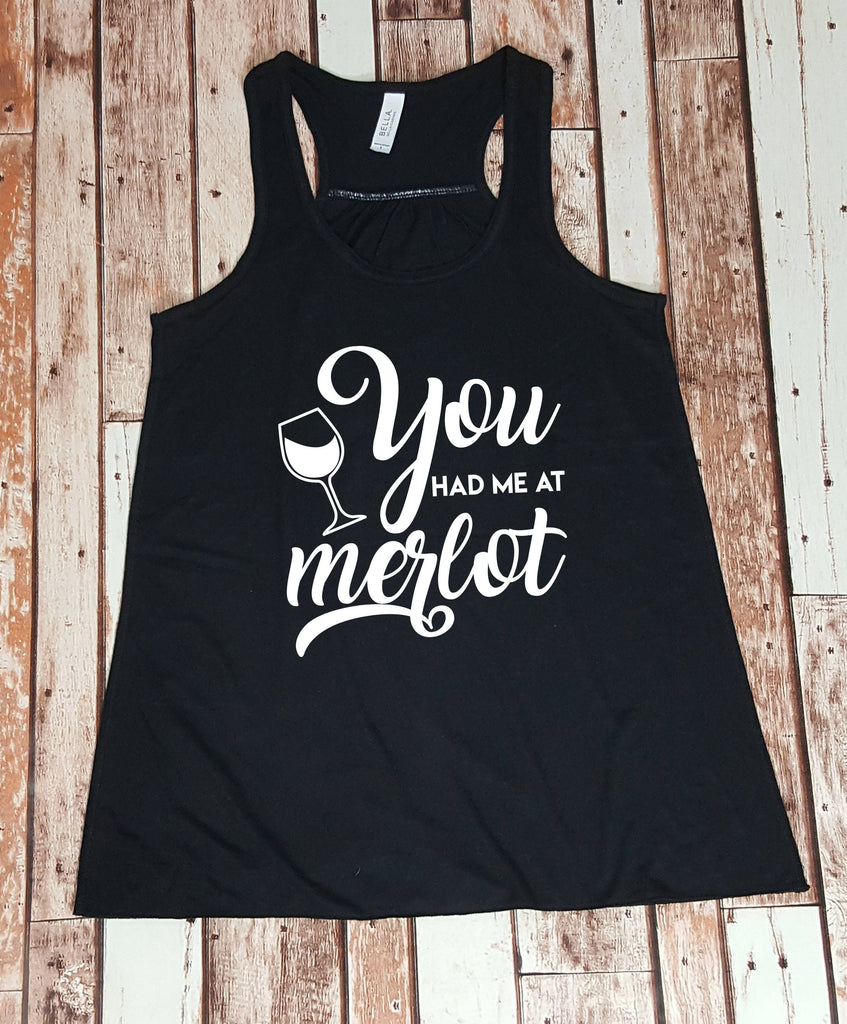This listing is for (1) flowy tank, as seen in the pictures, that says: "You Had Me At Merlot" A super soft tee, for a girls night out or a night in with a glass of RED wine!