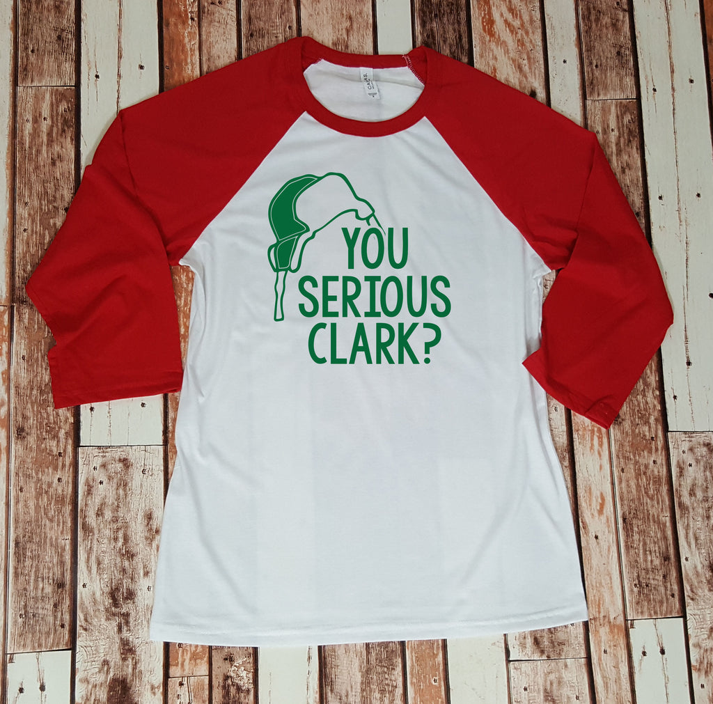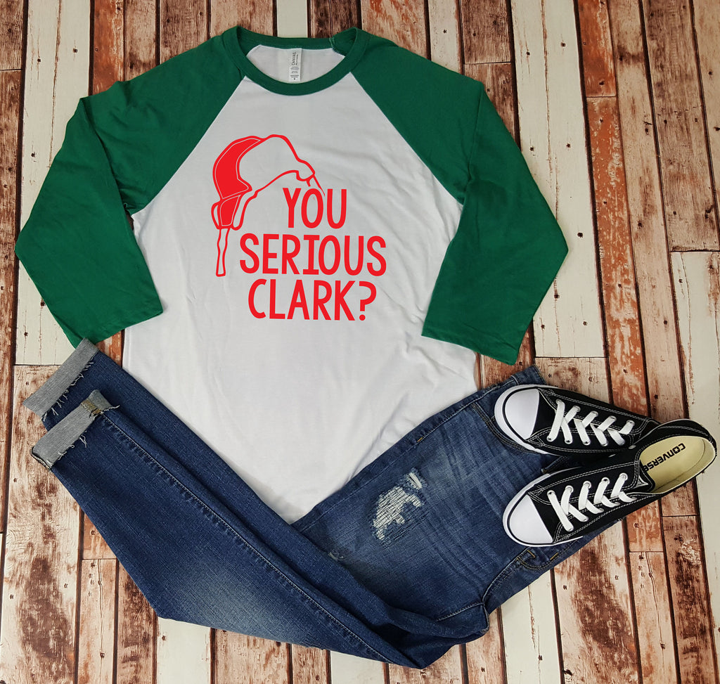 This listing is for (1) tri-blend baseball shirt, as seen in the pictures, that says: "You Serious Clark?" If you love Fall, and you love puns, you know what we're talking about!